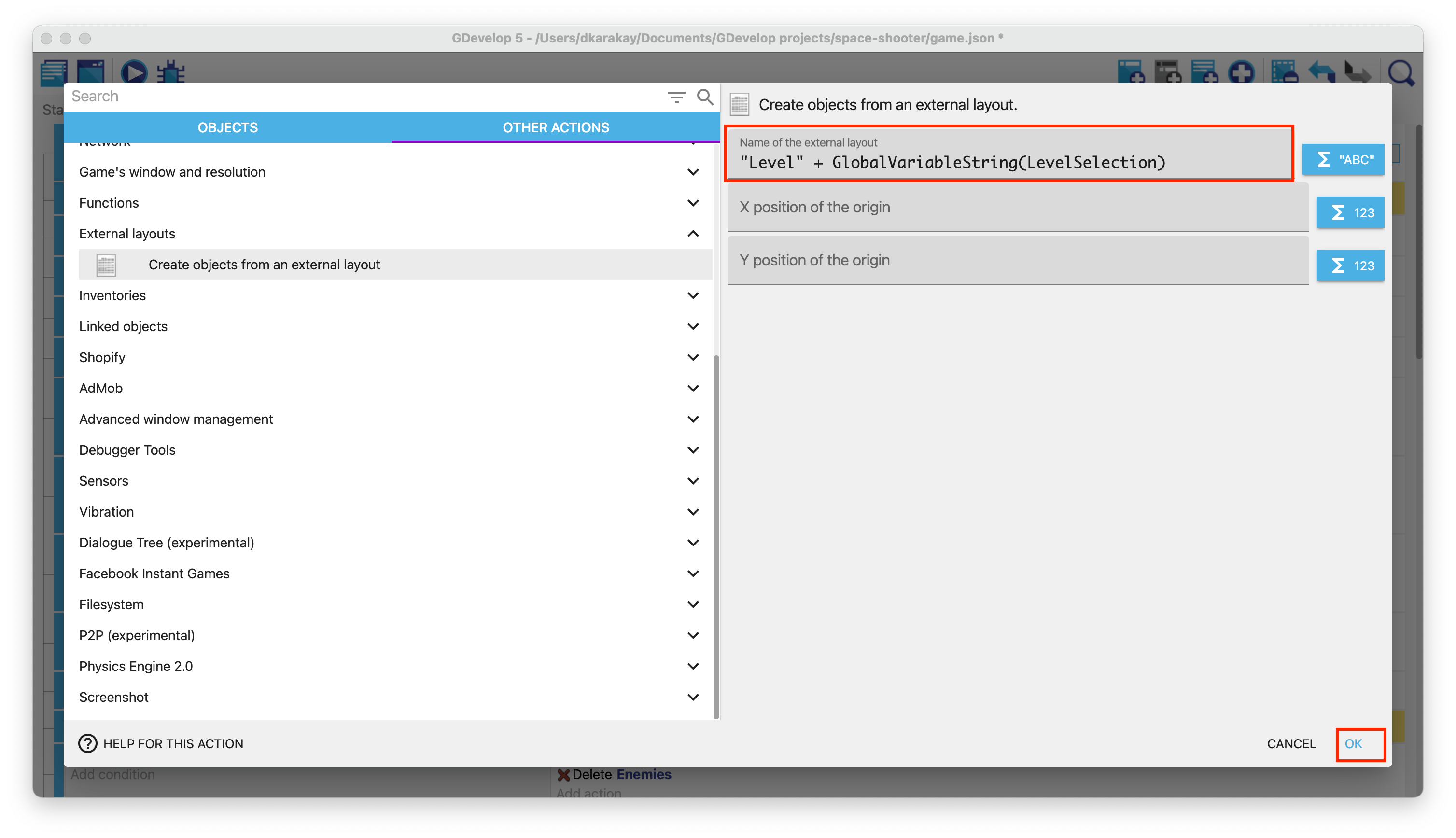 Open the events of Base Scene and find the event to create objects from external layouts.